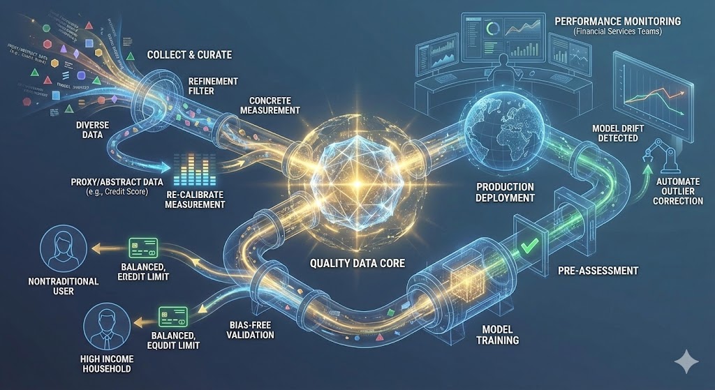 Quality Data is the core of our ML models and key to ensuring performance accuracy as we go through the complex cycle of MLOps in collecting and curating data, provide our model training, pre-assess it for deployment, and if found to meet bias free and validation goals deployed to the world for production. For example, in our credit card product line, any ML Model to decide credit limits will need data preparation that accounts for measurement bias, a proxy for concrete measurement, such as abstract credit score, in such a way that it harms nontraditional users of credit as their measurement may be systematically lower for credit than high income households. Critical stages follow the tail-end of the MLOps process to managing the efficacy of the model through deployment and after, to monitor production performance of the model by user populations in internal businesses included but not limited to financial data services teams. We also need to assess for model drift where we automate tasks to look for outliers and any change in accuracy of the model to generalize solutions over time as new data is produced.